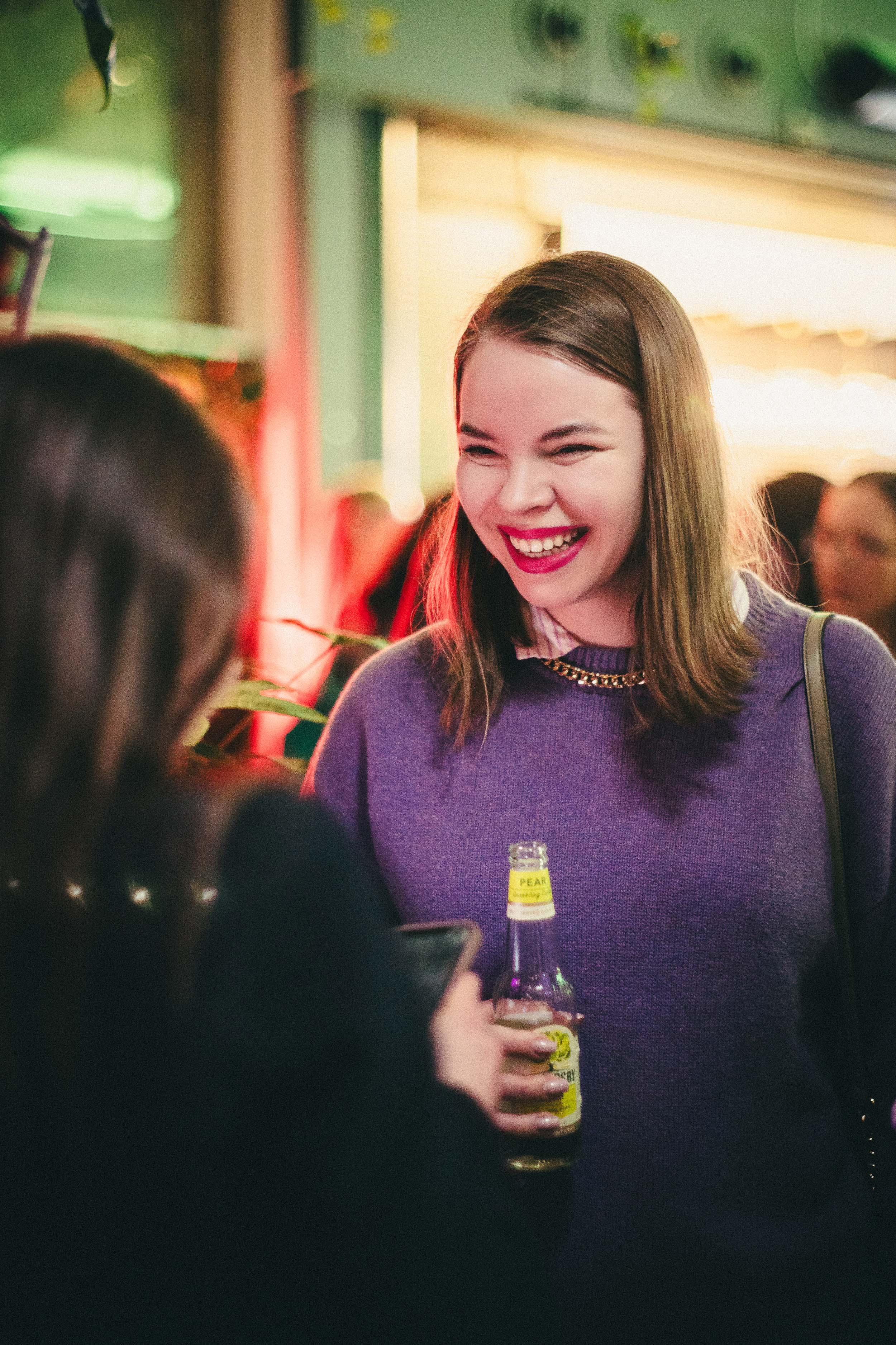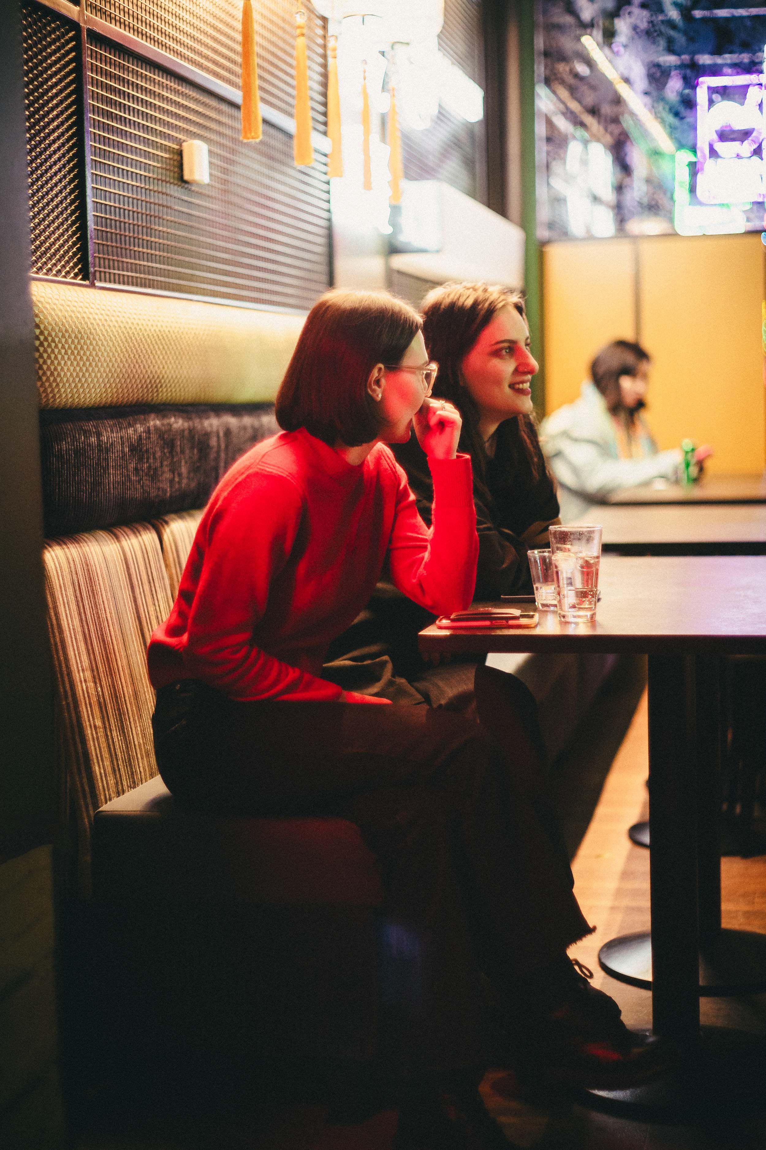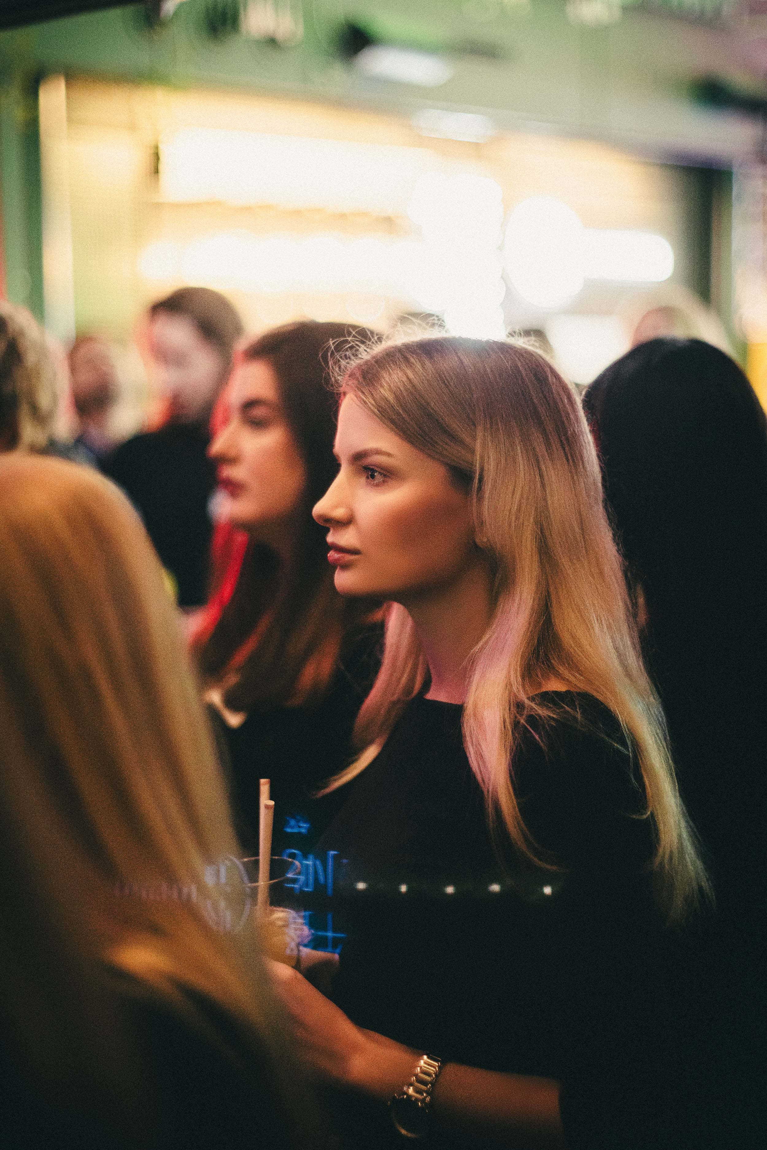 The venue was a popular bar in the very heart of Stockholm—colorful, hazy lamps, low light, and an atmosphere that felt very Japan-inspired. That’s how I imagine wandering the streets of Tokyo at night. The lighting was challenging—dim, flickering, with constantly shifting colors—but my vintage Japanese lens loved this scenario and truly shone. I purposefully chose not to use flash, so as not to distract the participants. Instead, I worked in a very documentary style—moving around the venue, searching for different faces, genuine emotions, and flattering angles.